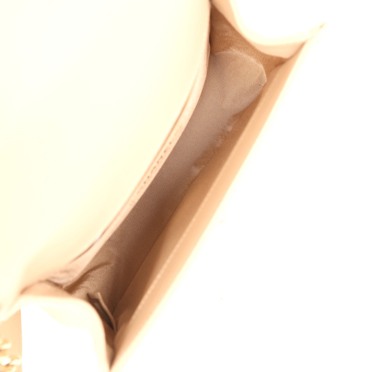 The interior is lined in beige grossgrain fabric and has one slit pocket on rear wall.